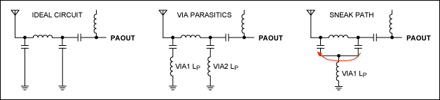 寄生電感往往對旁路電容的連接影響很大。理想的旁路電容在電源層與地層之間提供高頻短路,但是,非理想過孔則會影響地層和電源層之間的低感通路。典型的PCB過孔(d = 10 mil、h = 62.5 mil)大約等效于一個1.34nH電感。給定ISM-RF產品的特定工作頻率,過孔會對敏感電路(例如,諧振槽路、濾波器以及匹配網絡等)造成不良影響。