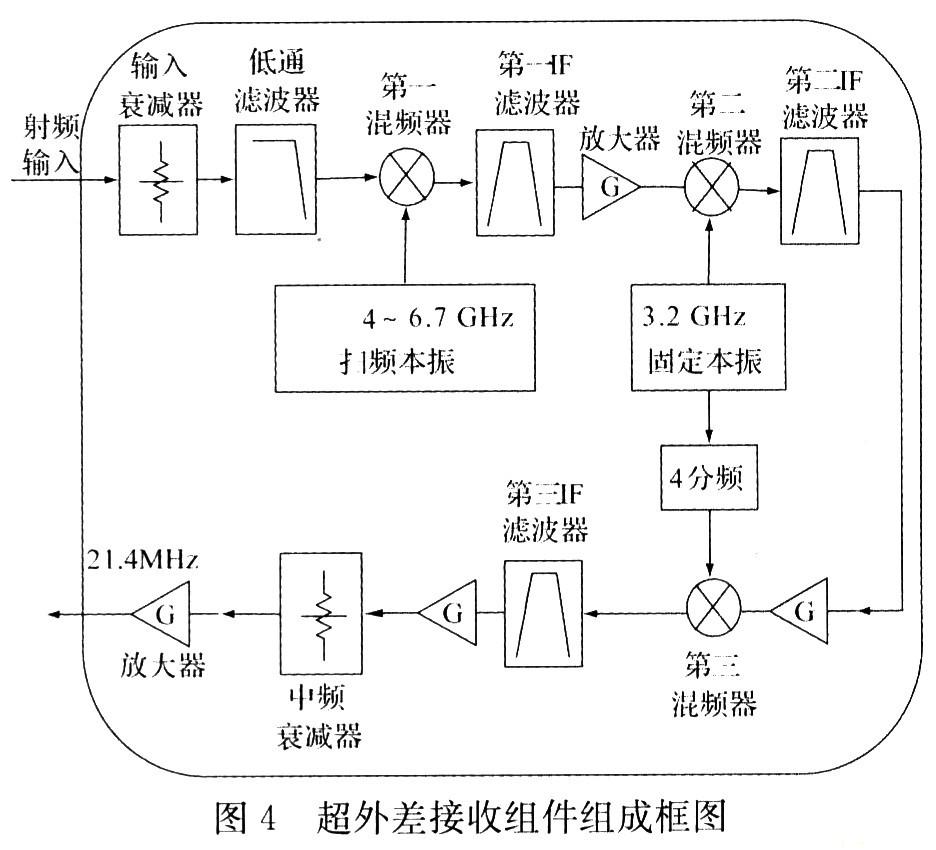 組件采用三級混頻方式實現(xiàn),第一中頻4 021.4 MHz,第二中頻821.4 MHz,第三中頻21.4MHz,這樣選擇的目的是第三混頻需要的800 MHz本振可以由第二混頻需要的3.2 GHz本振4分頻產(chǎn)生,從而減少了本振數(shù)量,降低了體積。