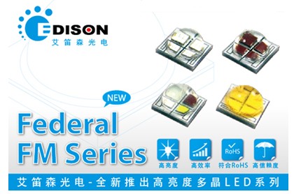 Federal FM系列組件,冷白光在700mA的操作下時最高輸出可達750流明,暖白光則可達550流明的表現。單色光系列,在700mA的操作電流下,可提供紅光380流明,綠光540流明,及藍光150流明之杰出表現。高亮度及高性能的特性使其可運用于需要高流明表現的領域,包含室內照明、商業照明、工業照明或是替代光源燈泡。為加速客戶將產品導入應用,艾笛森光電也推出一系列適用對應透鏡,供使用者依個別需求做搭配使用。