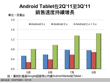 其中,Android 3.x Tablet月銷售水平逐漸逼近7寸Android 2.x的產品。林俊吉預估, 2011年第三季通過 Google 認證的 Android Tablet 產品整體銷售量預期可達450萬~500萬臺,約為iPad同期的1/3~1/2,全年銷售則約為 iPad 的1/3~2/5。