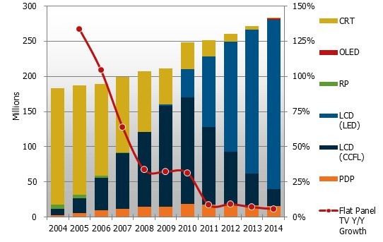 - 2004至2014年比較全球電視出貨與未來預測