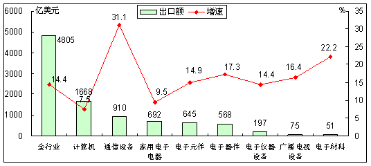 整機行業出口分化態勢明顯。1-9月,家電與計算機行業出口保持緩慢增長態勢,出口額分別為692和1668億美元,同比增長9.5%和7.5%,增速低于全行業平均水平4.9和6.9個百分點;通信設備行業出口保持較快增長,出口額910億美元,同比增長31.1%,增速高于全行業平均水平16.7個百分點。與上半年相比,家電行業出口增速回落1.5個百分點,計算機行業提高2.3個百分點,通信設備行業回落4.5個百分點。