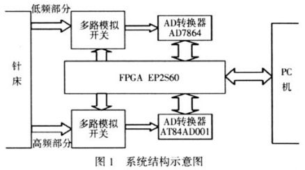 本自動測試系統的結構框圖見圖1。系統的工作原理是:通過針床將待測信號導出,FPGA 通過控制多路模擬開關將待測信號采集進來,將數據通過相應協議傳送到PC 機,用自動測試軟件測試各個信號是否正常。