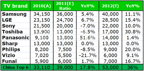 而今年Sharp以日本市場為主軸;Toshiba以日、歐為主要銷售地區,年成長表現衰退;Sony銷售地區橫跨歐、美、日,除了區域性需求不振,加上其組織策略反映較緩慢,不僅財報未見起色,年度液晶電視出貨目標更呈現7%之衰退,下修至20百萬臺;Panasonic因購買Sanyo品牌,看似整體市占率提升,但內部獲利壓力頗大,除打算出售位于日本茂原的六代廠,亦將減少8.5代廠的產能,后續仍須觀察;Philips以歐洲為主要市場,難幸免于歐債風暴沖擊;Vizio面臨與LGD之合作關系生變,加上北美市場不景氣,年度銷售量下滑幅度甚鉅;反觀大陸品牌挾帶雄厚資源,年度銷售量成長依舊維持在17~18%左右,市占率更達19~20%,2012更預估有3成之成長力道。