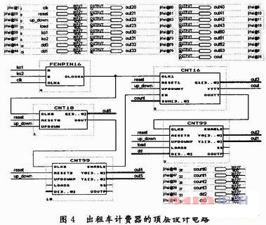 頂層設計采用原理圖輸入方式。通過調用生成的各模塊符號,并將它們作適當連接以實現頂層文件的設計。出租車計費器的頂層設計電路,如圖4所示。