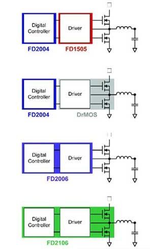 FD2004可以與外部柵極驅動器 (如FD1505) 和分立式MOSFET ,或是集成了驅動器與MOSFET的單封裝DrMOS產品協同工作。它還可以在獨立式應用中通過電阻 來編程—特別地,輸出電壓的最大值由電阻設定,且利用軟件命令設定的電壓最大值不得超過10%以上,以保護負載。在需要較大電流的應用中,如多相轉換器,所選的架構可實現多達8個相位的電流共享,而且可在輸出功率較低時實現切相 (phase shedding) 來保持高效率。該款控制器基于帶自適應性能算法和環路補償的數字控制環路,支持高達1.4MHz的開關頻率。時鐘同步可協助提升EMI性能。對于同時需要集成式驅動器和分立式外部MOSFET的應用,FD2006也是個不錯的選擇。
