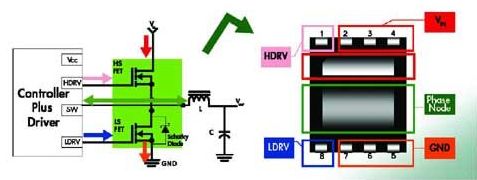 1.帶驅動器和MOSFET的分立式解決方案現在仍在普遍使用。為滿足所有設計要求,現在飛兆半導體提供的采用小尺寸熱性能增強型MLP(QFN) 封裝的產品,可獲得高系統性能。MOSFET實現了首先采用MLP封裝(見圖3所示)。其Power56和Power33產品系列采用最新的PowerTrench技術,能夠同時提供超低RDSon 和低Qg,從而適用于高開關頻率應用。鍵合技術可減小封裝的電感 ,提高封裝有限的ID ,適用于大電流應用。其低端FET產品組合采用SyncFET集成了肖特基二極管 ,在實現高開關性能的同時降低了熱耗。