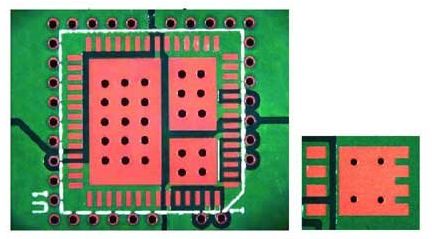 至于版圖布局,金屬較多顯然很有助益。更厚的頂層有助于降低溫度,不過也許對PCB的其余部分并不適合,因為成本增加了,其它元件需要的更精細的間距也不可能實現。更大的銅面積很有用,但又會消耗PCB空間。這些應該盡可能由焊料覆蓋,因為金屬表面比涂漆表面的散熱性更好。在多層PCB中,有時利用內層來協助散熱。熱通孔 (填充焊料) 有時可用來把熱量擴散到PCB的另一面去 (圖9)。