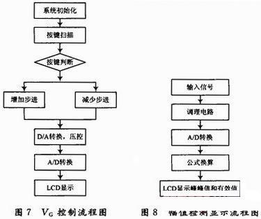 MSP430系列單片機是美國德州儀器(TI)1996年開始推向市場的一種16位超低功耗的混合處理器(Mixed Signal Processor)。由于它具有極低的功耗、豐富的片內外設和方便靈活的開發手段,已成為眾多單片機系列中一顆耀眼的新星。對于MSP430系列而言,由于引進了FLASH型程序存儲器和JTAG技術,不僅使開發工具變得簡便,而且價格也相對低廉,并且還可以實現在線編程。程序采用C語言開發。VCA810的VG控制以及輸出電壓幅值檢測、顯示的流程圖如圖7、圖8所示。