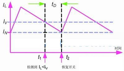 一般而言,通常采用比較器來檢測IL是否超出IV,以決定關斷或重新開通。可是,比較器會帶來延時tD,影響閾值的有效值。如圖2所示,比較器在t1時刻檢測到IL< p> V,可是偶遇延時tD,開關會在t2時刻被恢復。基于這個原因,有效閥值IN便會低于IV,這樣,實際的輸出IOUT(CL)為: