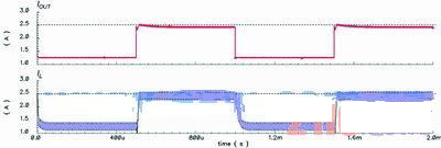 為了說明這個方案,圖1中的降壓轉(zhuǎn)換器會采用這些配置:L=20mH、COUT=47mF、RL值在2.64W(正常模式)~1.1W(電流限制模式)間轉(zhuǎn)換,并會使用一個tD=100ns的比較器,而IOUT(CL,DES)和IL(RIPPLE)分別是2.5A和0.3A。不過,如果使用傳統(tǒng)的峰值電流限制方法,那么式(1)中的IV便會設定為2.35A,傳統(tǒng)方法的模擬結果如圖4所示。由此可以看到,IOUT(CL)會由于tD的影響而低于2.5A。然而,使用新方法并將ILR設定在2.5A,IOUT(CL)便可如圖5所示達到2.5A。于是,傳統(tǒng)方法中出現(xiàn)的問題便能夠在該方案中解決。