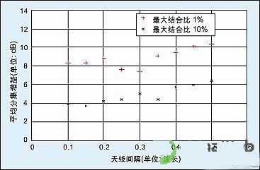 圖6:在市區、非LOS環境下,空間分集測量中平均分集增益與天線間隔關系圖