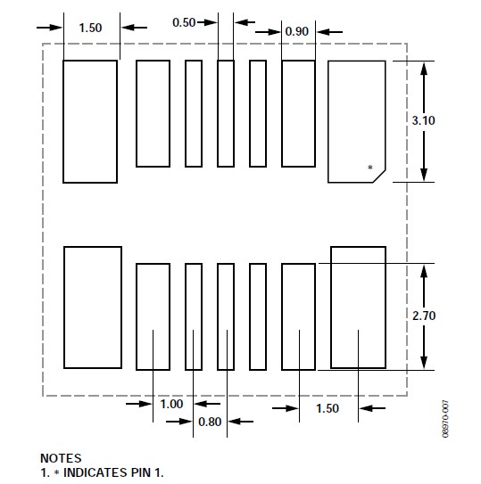 關(guān)于垂直和水平安裝方向的CVMP焊盤布局(焊盤圖形),請(qǐng)參閱本應(yīng)用筆記的"焊盤布局"部分。CVMP背面的焊盤布局如圖7所示。注意,封裝正面上有一些額外的焊盤(見(jiàn)圖4)沒(méi)有顯示在焊盤布局中,這些焊盤用作測(cè)試點(diǎn),不應(yīng)進(jìn)行電氣連接。