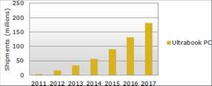 附圖 : 2011-2017 Ultrabook超薄筆電出貨預測(單位:百萬臺)資料來源: NPD DisplaySearch BigPic:460x187