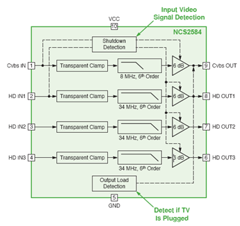 視頻信號放大器包括NCS2566、NCS2564、NCS2584、NCS2563、NCS2553、NCS2561、NE592x8和NE592x14等。圖1是NCS2584的框圖,可以看到,其關(guān)斷檢測用來進(jìn)行輸入視頻信號檢測,輸出負(fù)載檢測用來檢測是否有電視接上插座。