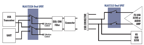 安森美半導(dǎo)體的USB開關(guān)器件包括NLAS7242、NLAS4717EP、NLAS7213、NCN9252和NLAS8252等,主要功能是處理USB 2.0高速信號,具有3.0 V電壓時6.5Ω的典型導(dǎo)通阻抗、500 MHz帶寬,以及低串?dāng)_(250 MHz時為-45 dB),采用業(yè)界最小封裝。圖2是NLAS7222A雙SPDT和NLAS7213雙SPST框圖。