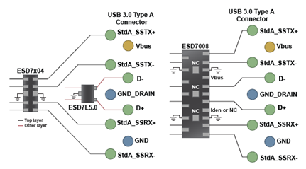 此外,還有針對消費(fèi)產(chǎn)品的USB 3.0器件(ESD7008、ESD7104、ESD7004和ESD7L)。這些器件符合電容低于0.5 pF要求,提供最低0.15 pF的超低電容,采用穿越型(flow-through)布線,提供領(lǐng)先業(yè)界的低鉗位電壓。