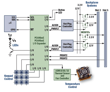 安森美半導(dǎo)體的級聯(lián)I/O擴(kuò)展器采用I2C和SMBus接口和1 MHz的SCL時鐘頻率,具有30 mA SDA灌電流能力,可用于背板系統(tǒng)等應(yīng)用,實現(xiàn)鍵盤控制、溫度控制、熱插拔控制等功能。圖6是背板系統(tǒng)的各種控制功能。