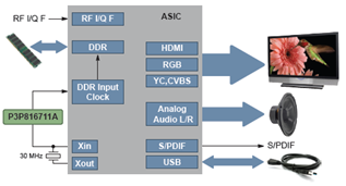 在機(jī)頂盒的DDR存儲器EMI抑制應(yīng)用中,使用P3P816711A可降低1倍LVCMOS峰值EMI,可30 MHz的輸入?yún)⒖紩r鐘,并提供30 MHz ± 0.3%輸出時鐘。