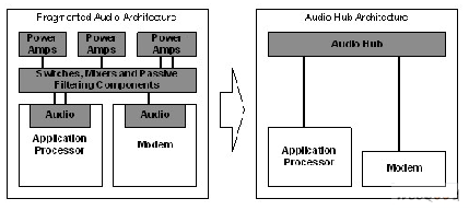 近年來發(fā)展起來的音頻中心(Hub)解決方案,通過將所有所需的音頻功能集整合到一個單芯片上,能夠方便地將高性能應(yīng)用處理器和更具成本效益的調(diào)制解調(diào)器的系統(tǒng)集成在一起。該解決方案消除了系統(tǒng)中的重復(fù),將元器件的相互依賴降到了最小程度,并為未來產(chǎn)品的研發(fā)提供了一個穩(wěn)定的平臺。