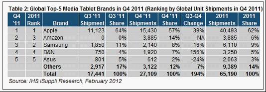 2011年全年,蘋果iPad出貨量為4050萬個,比2010年的1510萬個大增168%。去年蘋果的市場份額為62.0%,低于2010年的87%。在2010年的大部分時間里,蘋果獨占媒體平板市場。