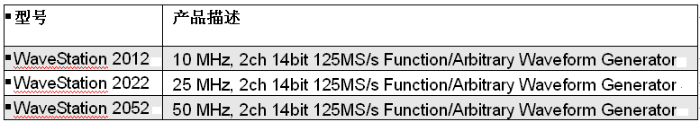 力科公司日前宣布發布WaveStationTM 系列函數/任意波形發生器。WaveStation最高信號生成頻率50MHz,提供3.5”大屏幕顯示,直觀的人機交互界面,全系標配雙通道輸出和PC端波形編輯功能。WaveStation系列包含三款型號,帶寬分別為10 MHz, 25 MHz和50 MHz;采樣率125MS/s,14-bit分辨率,每通道16Kpts存儲深度。WaveStation除擁有基本函數波形:正弦、方波、斜坡、脈沖和噪聲等信號之外,還內置了超過40種任意波形函數庫。創新的3.5”彩色顯示屏方便將預覽波形和波形參數同時顯示,如頻率、幅值、偏置和相位等。WaveStation提供了多種調制模式:AM, PM, FM, ASK, PSK, FSK和PWM,可以通過前面板直接編輯。儀器提供了必需的I/O接口方便與其他設備同步,同時提供標準USB和GPIB接口用于遠程控制和自動化編程,WaveStation的發布定位于強大,靈活的波形生成能力。
