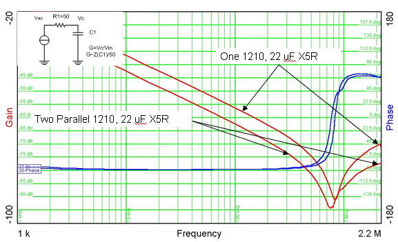 此外,還有一個與旁路電容有關(guān)的串聯(lián)電感,如圖 1 所示。頂部的曲線是貼裝在四層電路板上的一個22 uF、X5R、16V、1210 陶瓷電容的阻抗。正如我們所期望的那樣(100 kHz 以下),阻抗隨著頻率的增加而下降。然而,在800 kHz時有一個串聯(lián)電感,此時電容會變得有電感性。該電感(其可以從電容值和諧振頻率計算得出)為 1.7 nH,其大大高于我們 0.3 nH 的目標值。幸運的是,您可以使用并聯(lián)電容以降低有效的 ESL。圖 1 底部的曲線為兩個并聯(lián)電容的阻抗。有趣的是諧振變得稍微低了一些,這表明有效電感并不是絕對的一半。基于諧振頻率,就兩個并聯(lián)的電容而言,新電感則為 1.0 nH 或ESL 下降 40%,而非下降 50%。這一結(jié)果可以歸結(jié)為兩個原因:互連電感和兩個電容之間的互感。