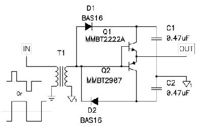 圖1中的示意圖顯示了一個NPN/PNP發射跟隨器對,其可用于緩沖控制IC的輸出。這可能會增加控制器的驅動能力并將驅動損耗轉移至外部組件。許多人都認為該特殊電路無法提供足夠的驅動電流。