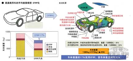 例如,按照碳纖維協(xié)會(huì)的推算,普通乘用車的平均車體重量為1380kg,如果盡可能采用CFRP部件,重量大約可以減輕30%,達(dá)到97Okg。CFRP的使用量占車體重量的17%左右,約為165kg,這樣一來(lái),如果10年的行駛距離為9.4萬(wàn)km,二氧化碳排放量可以減少5噸。