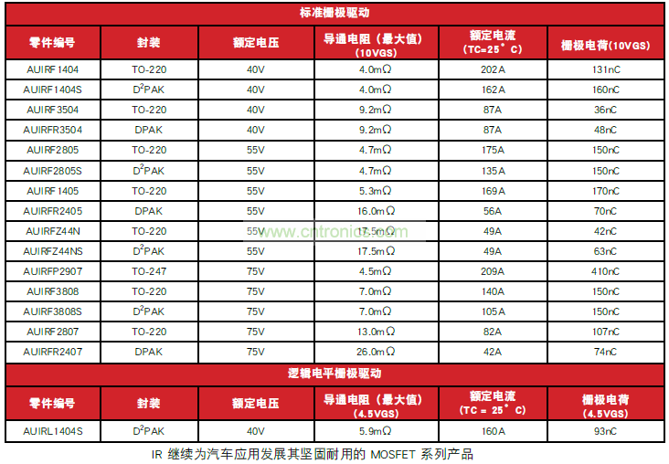 International Rectifier 的符合汽車標準的最新 MOSFET 系列具有低通態電阻和高電流處理能力,可滿足傳統內燃機(ICE) 平臺以及微型和混合動力汽車平臺方面的重負載應用。