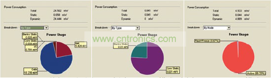 圖 1: IC 組件處于完全打開(左)、睡眠模式(中)和 80% 睡眠模式和20% 打開模式的組合(右)時(shí)的功耗。