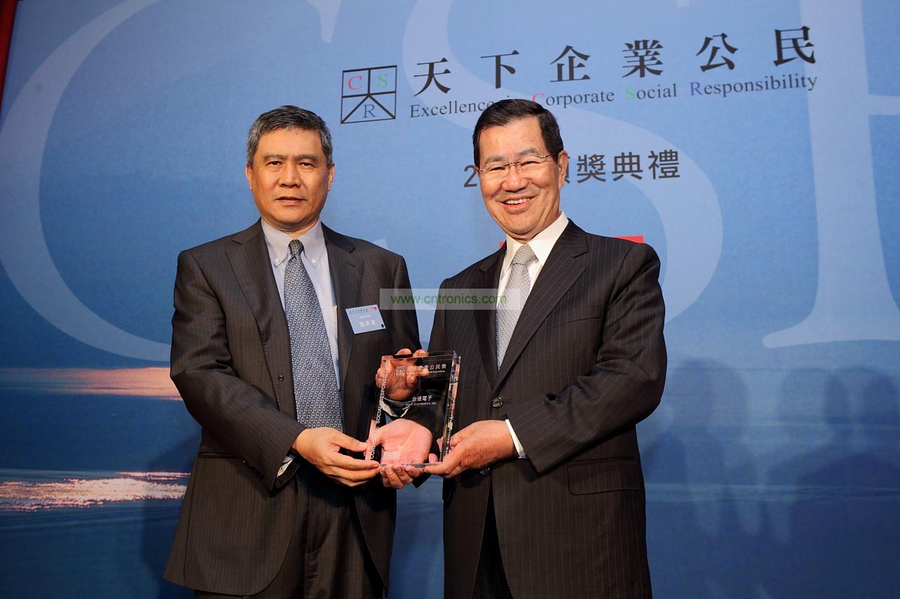 臺(tái)達(dá)電子海英俊董事長(zhǎng)(左)出席2012 天下雜誌企業(yè)公民獎(jiǎng)?lì)C獎(jiǎng)典禮, 自 蕭萬長(zhǎng)前副總統(tǒng)手中接過大型企業(yè) 首獎(jiǎng)