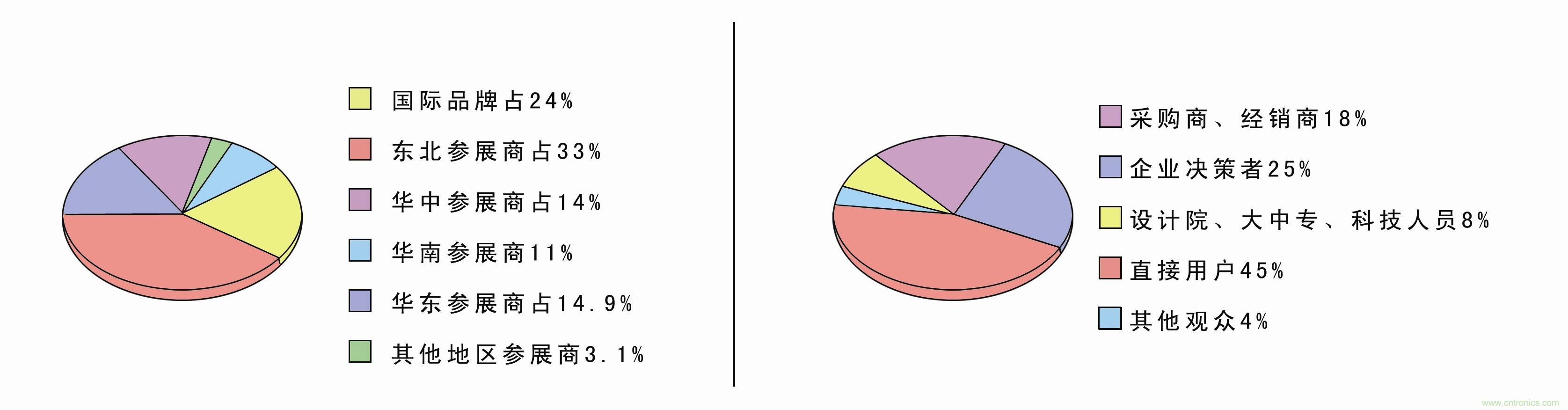 上屆展會(huì)于2012年5月16-18日在大連星海會(huì)展中心舉行,展會(huì)規(guī)模已達(dá)一萬多平方米,四百多個(gè)展位。世界知名的廠商:西門子、ABB、施耐德、三菱電機(jī)、奧托尼克斯、歐姆龍、LG、艾默生、寶帝、威圖、米思米、町洋機(jī)電、匯川等企業(yè)齊聚一堂,美國、日本、韓國等國外展團(tuán)的大量參與,使展會(huì)更具吸引力;展會(huì)的觀眾主要來自東北、華北、華東、華中、西北、臺(tái)灣、香港及日本、韓國、俄羅斯等地,其主要為相關(guān)行業(yè)的決策人士、技術(shù)人員及采購負(fù)責(zé)人。本屆展會(huì)為切合您的需求,直接面向?qū)I(yè)買家、進(jìn)出口商、分銷商、代理商和直接用戶,為您締造更多的商機(jī)!此次展會(huì)有參展商三百多家,參觀商兩萬余人,其中各占比例如下: