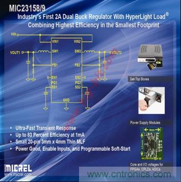 麥瑞半導體推出了兩款3MHz雙輸出2A高效降壓穩壓器MIC23158/9。得益于麥瑞半導體擁有專利的HyperLight Load®技術,這兩款集成電路為當今最苛刻的應用提供了超快的瞬態響應,包括機頂盒、針對FPGA的核心和I/O電壓、CPLD、ASIC、GPS/導航系統、PC卡、汽車儀表以及通用負載點(POL)直流-直流轉換等應用。MIC23158/9目前已經開始批量供應,千片訂量的價格分別為0.88美元/片和0.91美元/片。