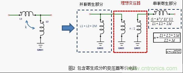 如果在這樣的天線中安裝一定變壓比的變壓器,是不能只整合一個band的阻抗的。所以,天線用變壓器,必備的設計需求是要使變壓比適應天線的阻抗頻率特性。這種適應方法如圖2所示,是一種將理想的變壓部分和寄生成分部分分解開來的等效電路。