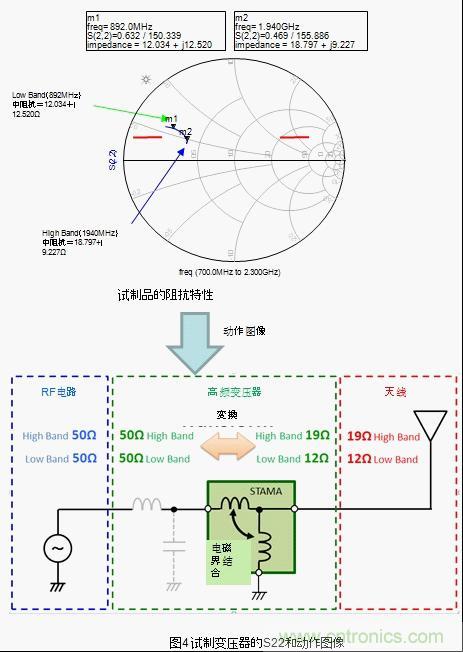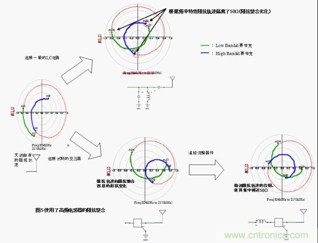 將普通的LC電路跟天線連接,根據頻率特性的不同在廣帶寬情況下阻抗整合會變得困難。針對該情況,將本次試制的高頻變壓器跟天線連接,low band和high band都轉換成了最合適的阻抗。也就是說,工匠圖上的阻抗軌跡有可能變化成阻抗整合容易的形狀。之后通過外部的調節元件將阻抗軌跡的相位進行微調,有可能非常容易的就集中在50Ω附近了。(圖5)