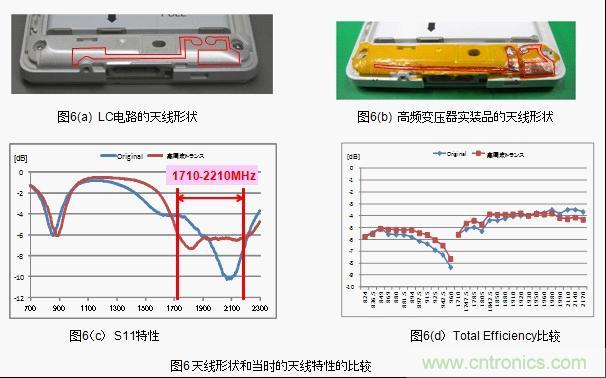 結果顯示,low band 情況下LC電路和高頻變壓器都不可能達到「S11<-6dB」(反射損耗1.2dB)。而high band情況下,達到「S11<-6dB」范圍的,如果使用LC電路的話是300MHz,而使用高頻變壓器的話則是500MHz,達到了66%的改善效果。(圖6(c)) 。此外,LC電路和高頻變壓器中天線的綜合特性顯示「Total Efficiency」,low  band的高頻側也得到了0.6dB的改善效果。(圖6(d))。這種改善效果正是由于帶寬的廣帶寬化和I.L.得到了改善。