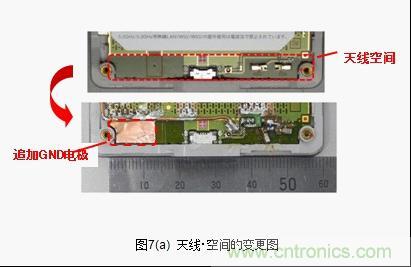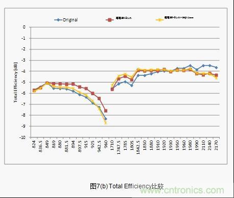 接下來將針對天線小型化的有效性進行檢測。一般來說天線具有改善接地距離的特性。但是,天線占據空間(排除了GND領域)很大的話天線以外的 元器件安裝空間就會受壓迫。天線小型化和縮小天線空間迫在眉睫。當天線空間的一部分被GND占據,對這時候的天線特性的變化進行評價。天線空間的寬度為52mm,其中13mm被GND占據,low band的特性劣化,變成了跟LC電路等同的Total Efficiency(圖7(b))。這就意味著實際上天線空間的面積可減少25%。