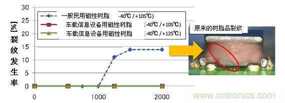 熱沖擊投入周期數(shù)和裂紋發(fā)生率的關(guān)系如圖3所示。一般民用市場的磁性樹脂在1000輪以下就會(huì)產(chǎn)生裂紋,而我們開發(fā)的車載信息設(shè)備用磁性樹脂在2000輪之后仍然沒有產(chǎn)生裂紋。并且確保即使在更嚴(yán)厲的-40℃⇔+125℃環(huán)境下的熱沖擊試驗(yàn)中也不會(huì)產(chǎn)生裂紋。