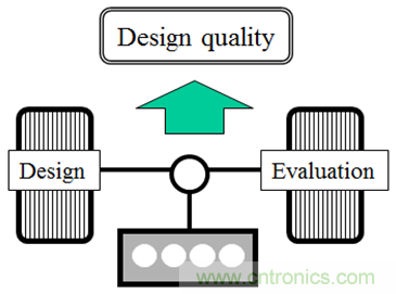 西森久雄在總結時表示:“通過提供來自T3Ster測量結果的結構函數,與設計值的比較和驗證可以更詳細的進行。在可靠性測試中使用這個測量方法已經幫助我們發現影響壽命的設計缺陷,而且由于設計值現在能夠測量出來,因此進行前端裝載成為可能。此外,我們還可以通過降低設計中的重復工作以降低原型成本。”(圖 3)西森久雄通過一個汽車隱喻很好地表達了他對設計和評估過程的觀點:“評估和設計就像質量保證的兩個‘輪子’,重要的‘發動機’則為輪子提供驅動力。通過適當地組合 CAD、CAE 和自動化測量,輪子將把‘優質的設計’帶到路上。”(圖4)