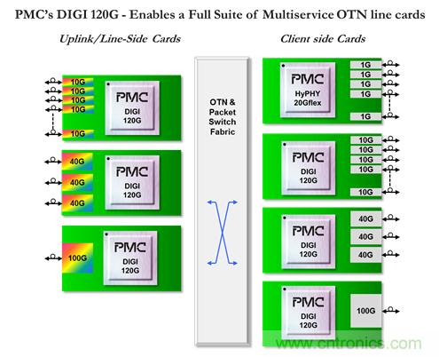PMC的DIGI 120G是一款功能強(qiáng)大的100G OTN處理器,設(shè)計(jì)初衷是實(shí)現(xiàn)下一代光傳送網(wǎng)絡(luò)。DIGI 120G提供了高度靈活的平臺(tái),使得OEM可以設(shè)計(jì)范圍廣泛的OTN解決方案,其中包括用于OTN交換的高密度線卡以及功能強(qiáng)大的用于P-OTN的混合OTN/分組線卡。DIGI 120G的獨(dú)特性在于: