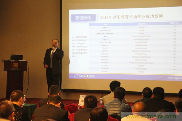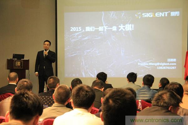 會議伊始,鼎陽科技董事長兼總裁秦軻先生進行了精彩致辭,總結了鼎陽科技在2014年取得的巨大成就,展望了鼎陽科技在2015年的宏偉前景,為鼎陽科技在新一年的持續高速增長擺下了棋陣。2014年鼎陽科技的銷售額增長了41%;MSO2000、SDS3000、SDM3000在取得了眾多工藝上的突破之后順利量產。去年,鼎陽科技美國分公司在克里夫蘭正式成立,為北美市場的下一輪增長做了堅實的鋪墊。2014年,鼎陽科技參加了海內外的多個大型展會,標志著鼎陽科技正式立足于測試測量儀器領域主流品牌的行列。與此同時,鼎陽科技與廣州工業大學深度合作,建立了聯合實驗室,第一屆鼎陽杯也圓滿落幕,增強了鼎陽科技在高校用戶群體中的知名度,進一步鞏固了鼎陽科技在教育領域的影響力。