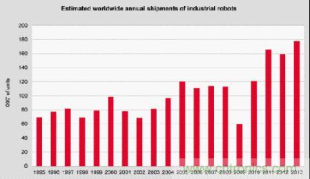 根據(jù)國際機器人聯(lián)盟(IFR)2014年統(tǒng)計顯示,2013年機器人出貨量增長12%,成長至178,132臺,如圖1所示,工業(yè)機器人持續(xù)在汽車、化工、橡膠、塑料等行業(yè)以及食品行業(yè)增加;2008年至2013年,中國的工業(yè)機器人每年總供應量平均增加36%,并且可促使該國成為世界最大的機器人市場。