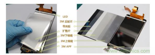 小編強大的產業(yè)鏈力量不是隨便說說的,這個背光模組里的光學膜材用的竟然都是那么貴滴的3M的光學增亮膜,這種增亮膜組合一般都是出現在高端手機里面的。上下兩張棱鏡膜幫助調整背光方向到人眼的觀看方向并提高屏幕軸向亮度。3M的APF多層膜可以幫助提升屏幕亮度,比無APF的屏幕提升40%以上。