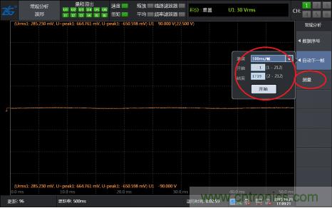 第三步,點擊圖 3菜單中“測量”區域,使界面出現“測量”字樣,此時儀器界面中的波形會停止刷新。然后通過“自動下一幀”菜單,選擇要查看的波形幀數,可以選擇從第一幀開始,到最后一幀介紹,然后設定每一幀的回放速度(從人眼的反應考慮,建議選擇200ms/幀以上),點擊開始之后,界面中的波形會進行回放,當看到想要看的波形后按停止按鍵,然后通過“數據序號”來調整波形,確??吹阶约合胍牟ㄐ危鐖D 4所示;