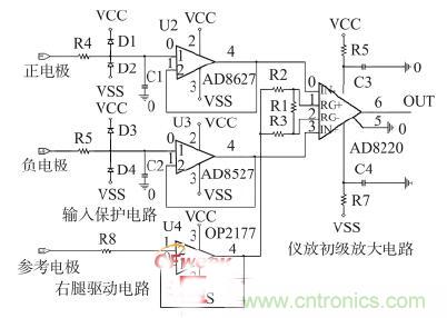 前置放大電路由前級放大電路、帶通濾波電路和50 Hz工頻陷波電路組成,其中,前級放大電路又包括輸入保護電路、右腿驅(qū)動電路和儀表運放放大電路組成,如圖2 所示。