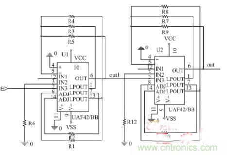 使用兩片UAF42 芯片構(gòu)成4 階陷波器增加陷波深度,設(shè)計工頻陷波電路Q 值為50, 50 Hz 陷波深度為- 110 dB。相比于傳統(tǒng)的雙T 陷波器,此陷波器中心頻率在設(shè)計時就可設(shè)置好,免去了陷波中心頻率的調(diào)試。此外,只需要連接設(shè)計時計算好電阻值的電阻器即可,免去了電容器的選型和匹配。