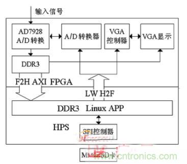 數(shù)字系統(tǒng)包括A/D 轉(zhuǎn)換模塊、VGA 顯示模塊、數(shù)據(jù)存儲模塊和算法處理模塊。SoC FPGA 中的HPS 和其它的硬件模塊可以通過Qsys 進行配置,用Quartus II 進行硬件設(shè)計,Qsys 和Quartus II 編譯可以產(chǎn)生軟件設(shè)計所需的信息文件。移植嵌入式Linux 系統(tǒng),下載sof 文件,用DS—5 進行基于Linux 的系統(tǒng)軟件工程開發(fā)。