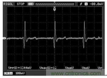受測者佩戴心電電極,用醫(yī)用導(dǎo)聯(lián)線接入到模擬前端采集電路,后端接入示波器,待信號穩(wěn)定后就可以在示波器上觀測到心電信號波形,圖5 即為模擬前端電路實際測試波形圖。