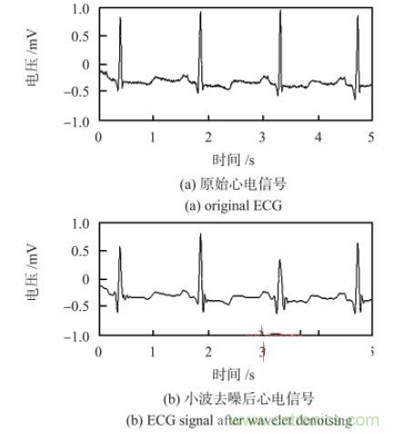 采用小波分析的方法進行心電信號去噪。小波分析由于能同時在時域和頻域中對信號進行分析,具有多分辨分析的功能,所以,在不同的分解層上有效地區(qū)分信號的突變部分和噪聲。對含有噪聲的原始心電信號進行小波分解后,噪聲部分主要集中在高頻小波系數(shù)中,包含有用信號的小波系數(shù)幅值較大,但數(shù)目少;而噪聲對應(yīng)的小波系數(shù)幅值小,數(shù)目較多。基于上述特點,選取無偏似然估計閾值對小波系數(shù)進行處理,然后對信號重構(gòu)即可達到消噪的目的。圖7 為心電信號小波去噪前后對比,信噪比可以達到121 dB。